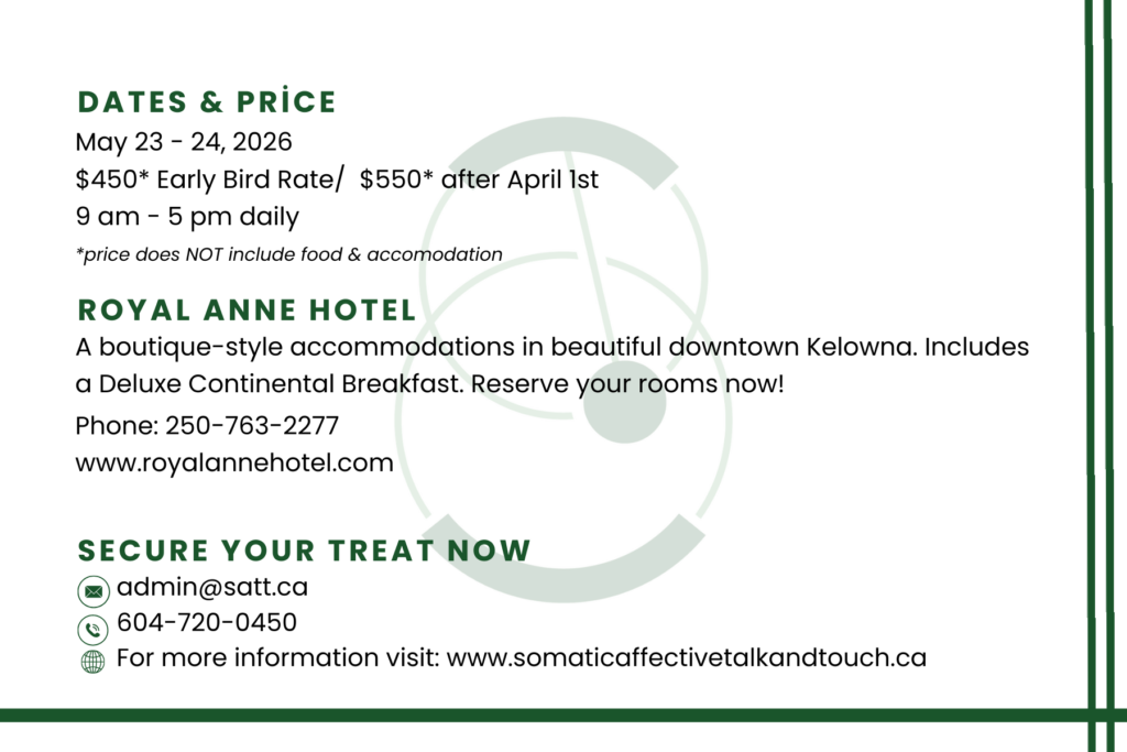 A 2 year Somatic Affective Talk & Touch® Training Program. SATT is a healing modality that uses gentle touch and simple dialogue to raise awareness and offer choice. It IS possible for your mind and body to move together with greater ease and comfort.