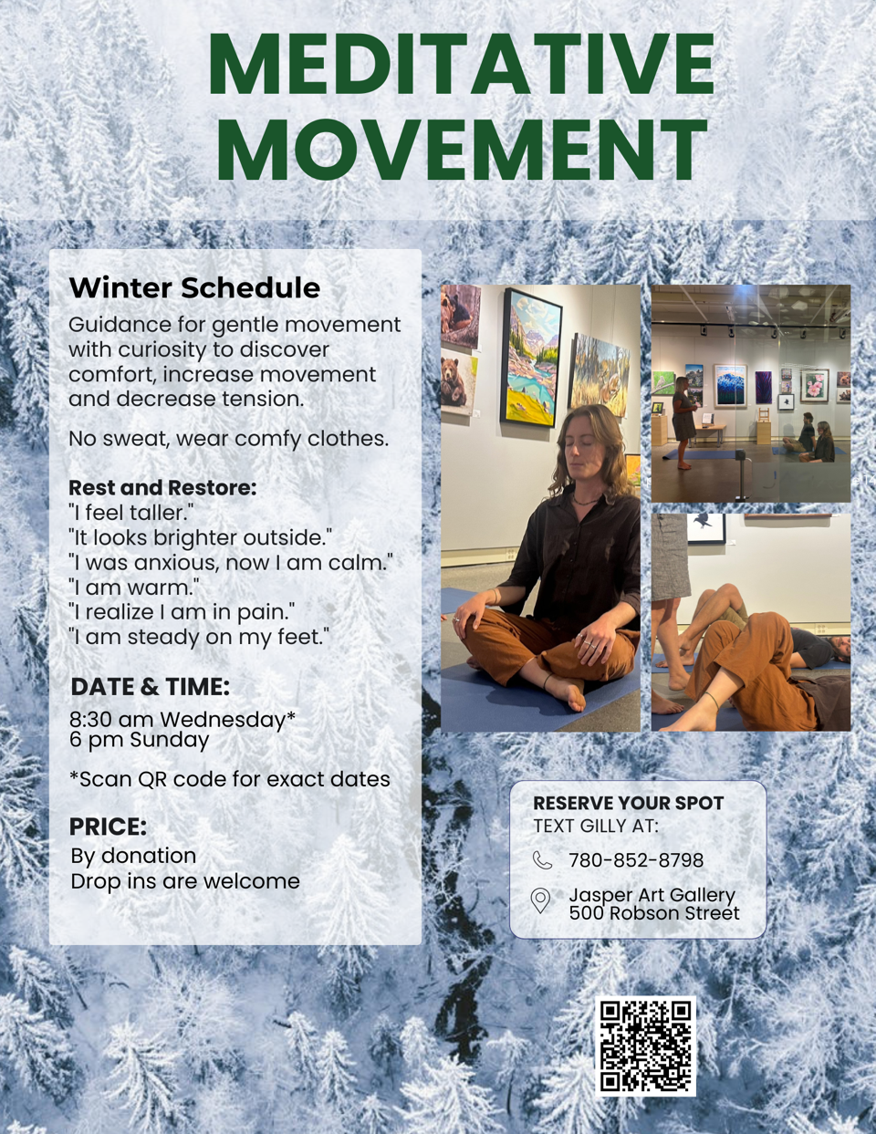 Wednesday: 8:30 – 9:30 am: March 4, 11, 25 Sunday March 8, 15, 29 (March 22 class is at 3:30 – 5 pm at Jasper Activity Center) Pre-registration is required. Text Gilly: 780-852-8798
